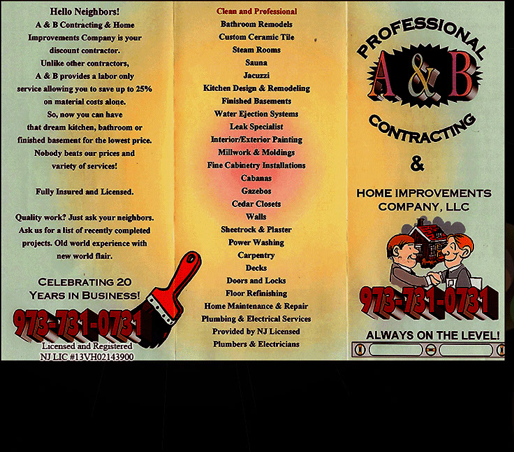 Hello Neighbors! A & B Contracting & Home Improvements Company is your discount contractor. Owner operated by Paul Goldstein. He takes one job at a time and completes it start to finish!